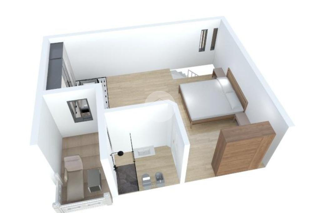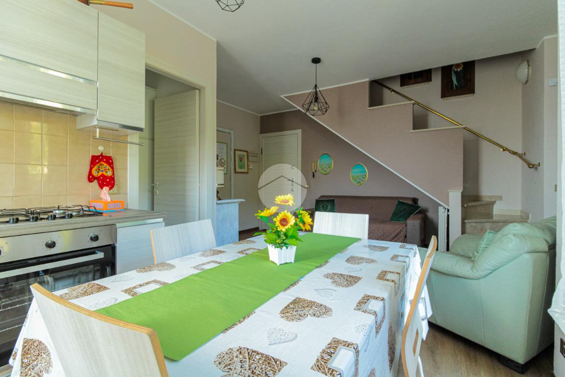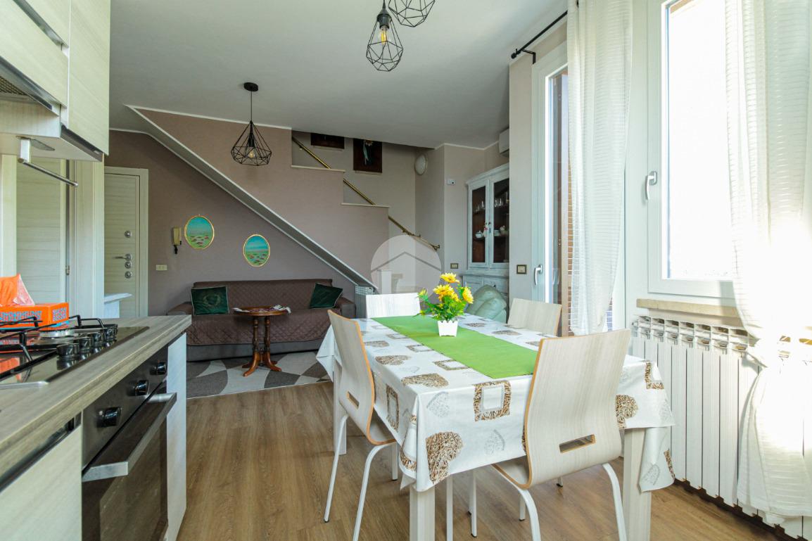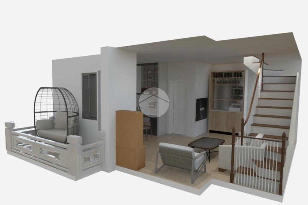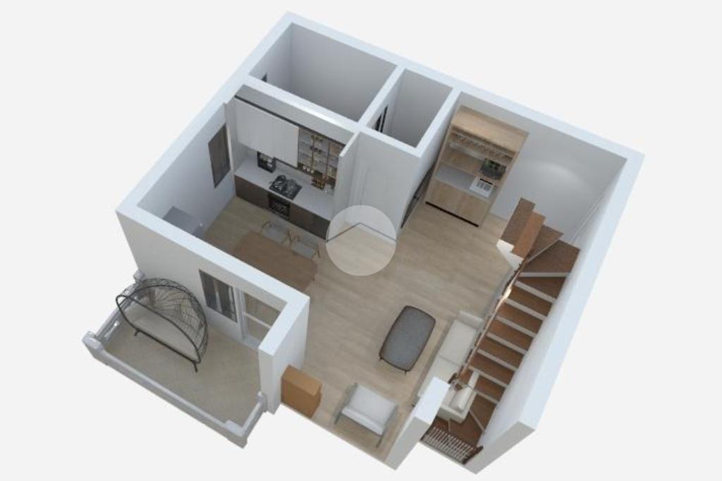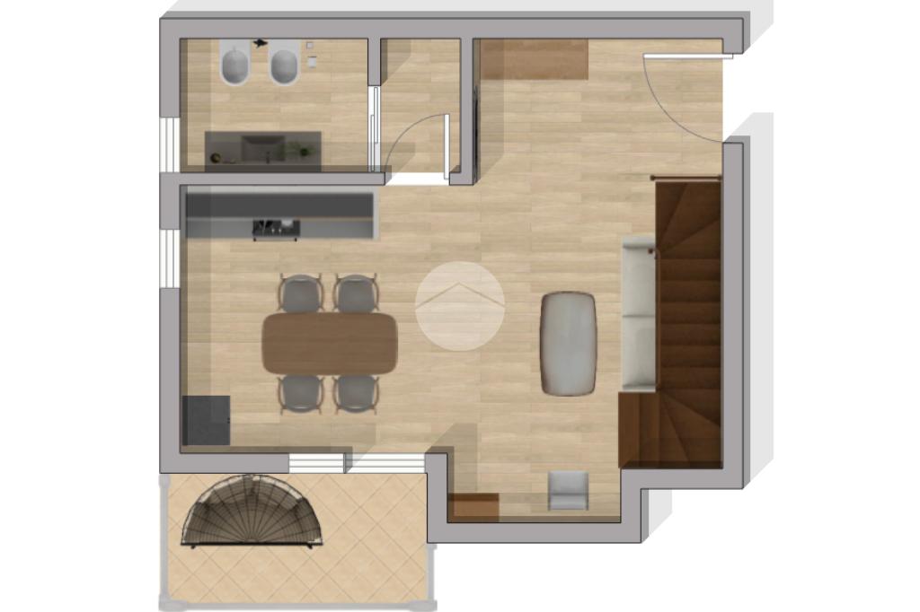 Al piano rialzato, zona giorno con angolo cottura open space con affaccio sulla terrazza, ed un bagno di servizio.