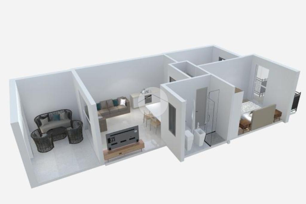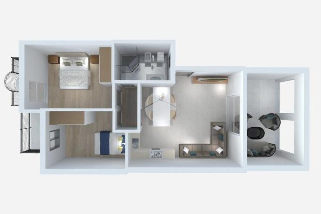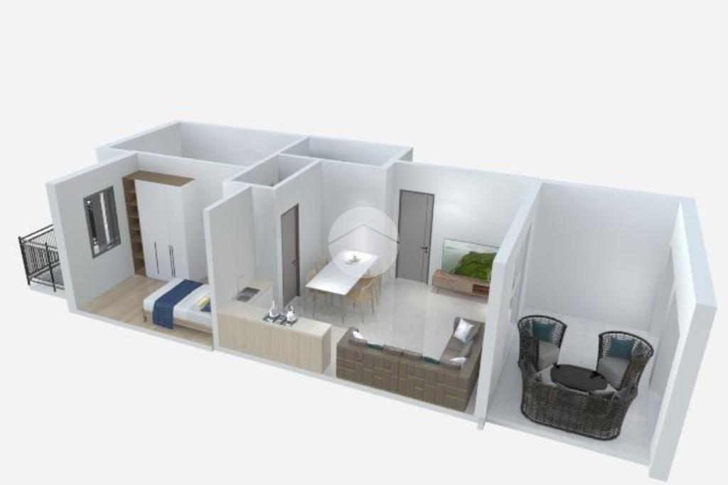 Sito al primo piano, l'appartamento è composto da zona giorno open space con affaccio sull'ampia terrazza abitabile, una camera matrimoniale ed una singola entrambe con balcone privato, ed un bagno con doccia.