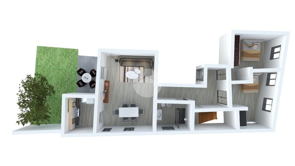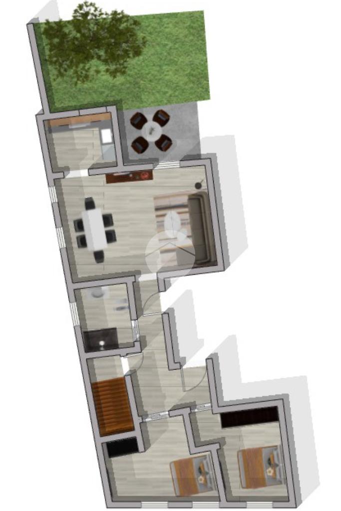 Zona notte dotata di due spaziose camere da letto matrimoniali, un bagno finestrato con doccia, zona giorno con affaccio sul cortile esterno privato ed una cucina separata.
