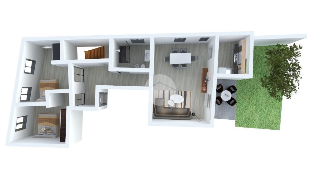 Schlafbereich mit zwei geräumigen Doppelzimmern, einem Badezimmer mit Fenster und Dusche, Wohnbereich mit Blick auf den privaten Innenhof und einer separaten Küche.