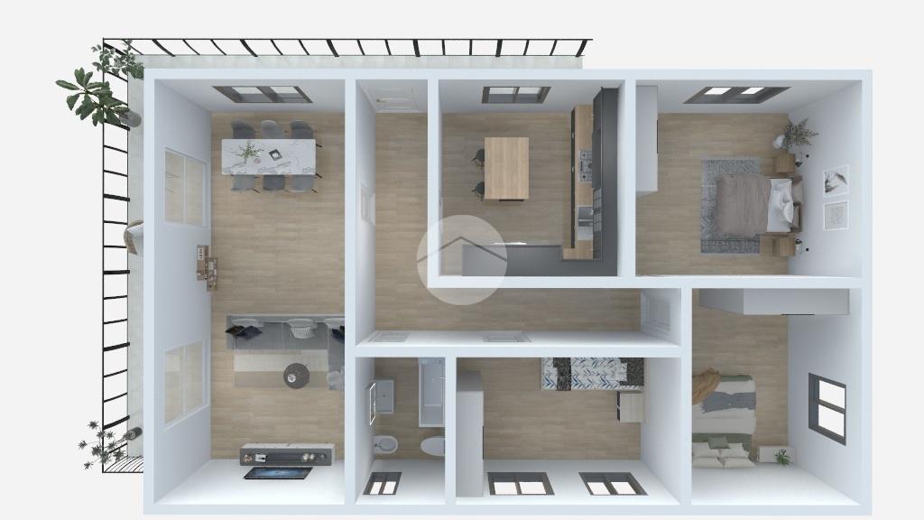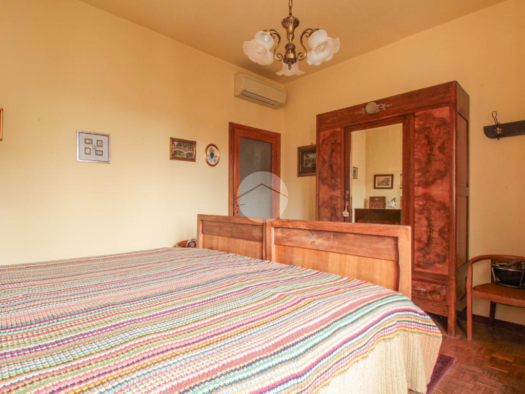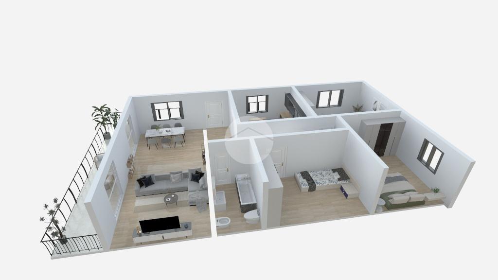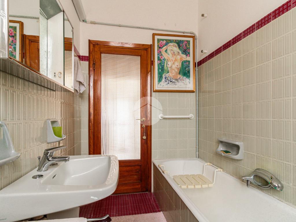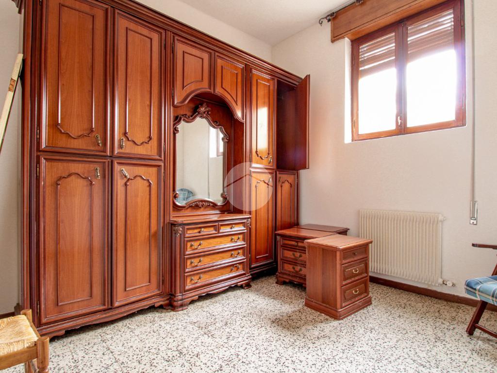 Climbing the external stairs, we reach the corner balcony that serves as the entrance to the second apartment, consisting of a large living area, a kitchen, two double bedrooms and one single bedroom, and a bathroom with window and bathtub. This apartment also has internal access to the garage.