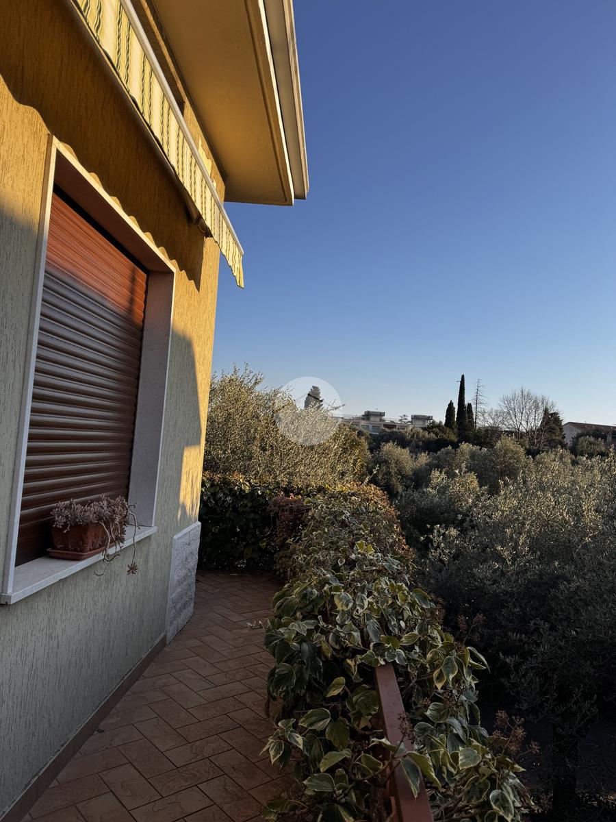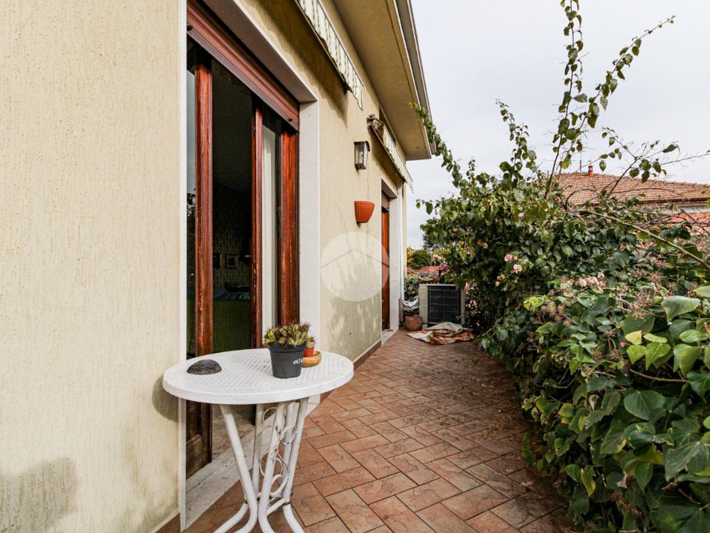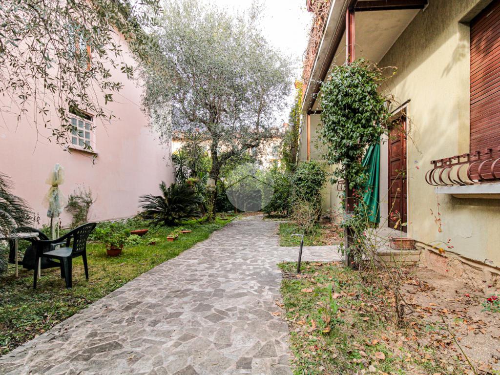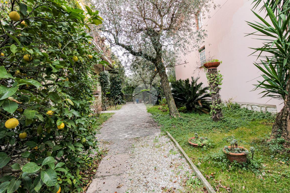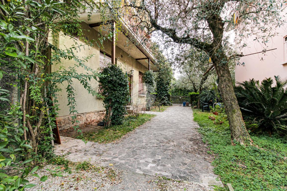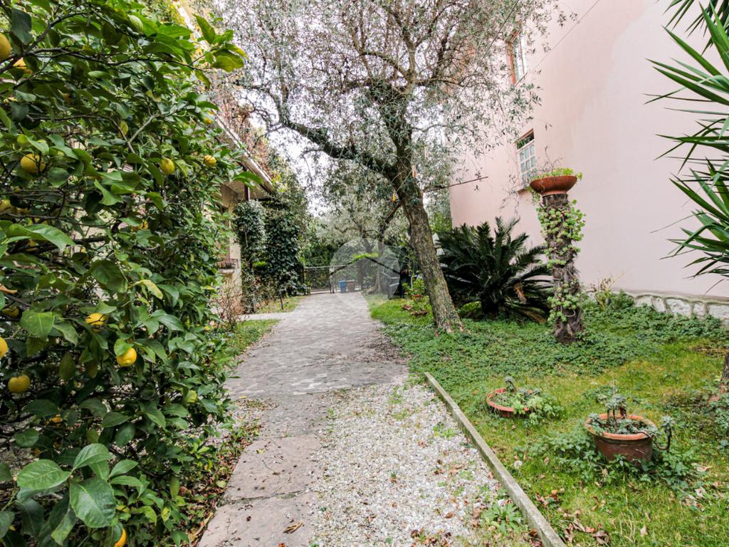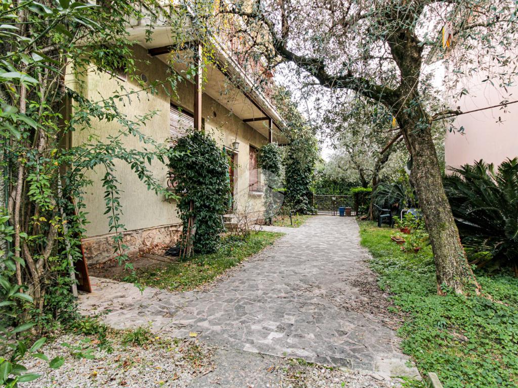 La proprietà ha due ingressi, uno pedonale ed uno carraio, ed è circondata su tre lati da un giardino privato.